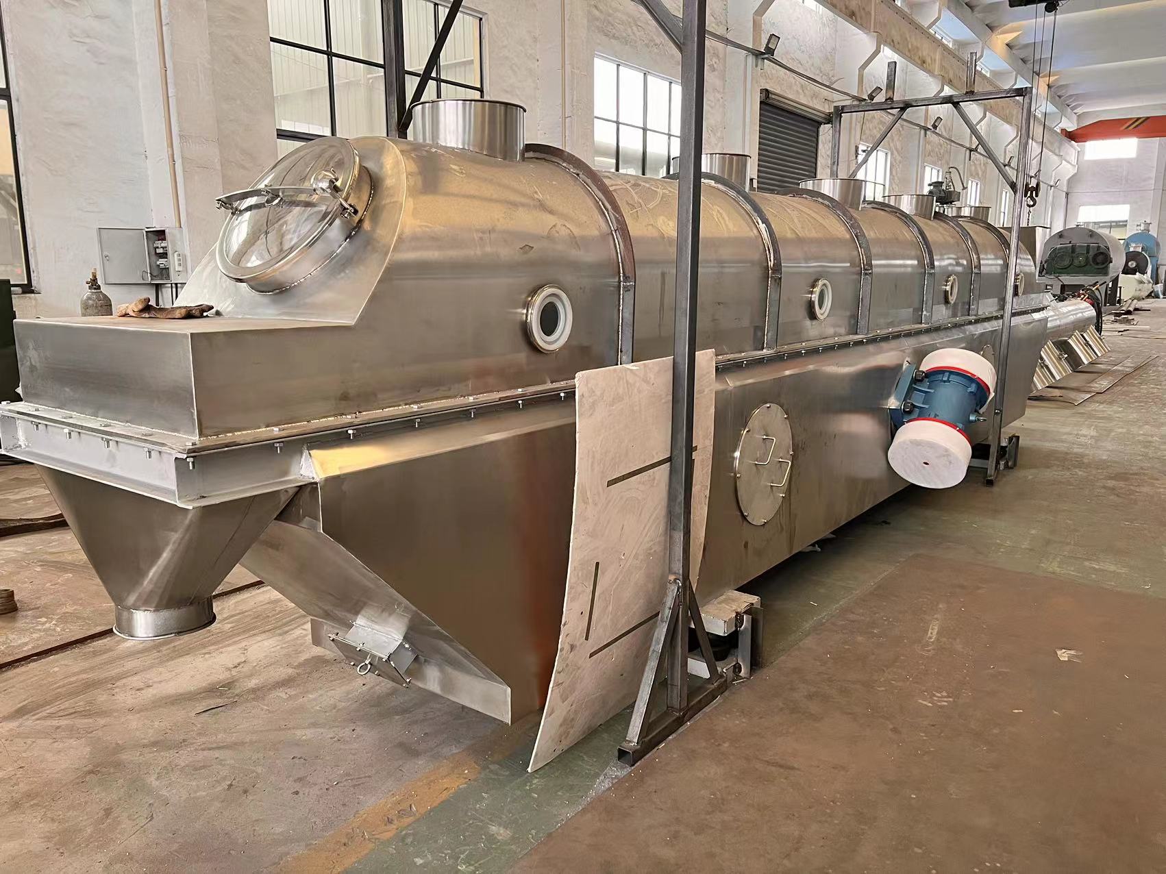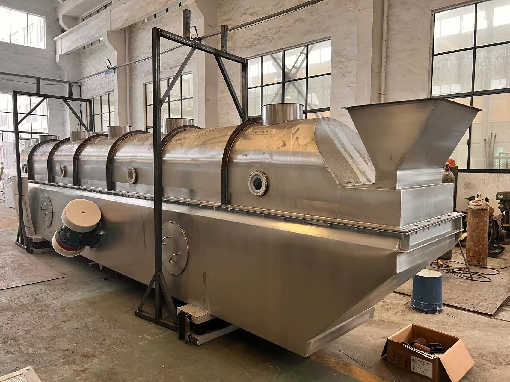 具有干燥效率*,干燥均勻,產(chǎn)量高,適用于同一品種的連續(xù)生產(chǎn),而且溫度較低、操作方便、占地面積小等優(yōu)點(diǎn)。但干燥室內(nèi)不易清洗,尤其不宜用于有色顆粒的干燥,同時(shí)干燥后細(xì)粉比例大。 據(jù)上述的含義,當(dāng)采用熱空氣為流化介質(zhì),在干燥食品濕物料時(shí),熱空氣則既為流化介質(zhì),又是干燥介質(zhì),起了雙重作用。而被干燥物料則在熱空氣流中一方面被吹起、翻滾、互相混合和摩擦碰撞,另一方面又在進(jìn)行傳熱和傳質(zhì),從而達(dá)到干燥的目的。