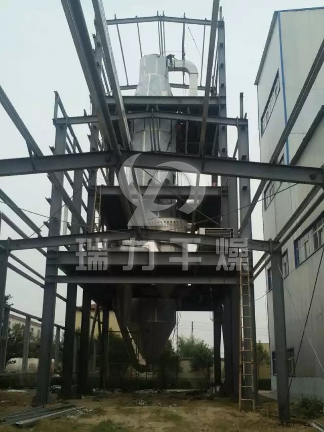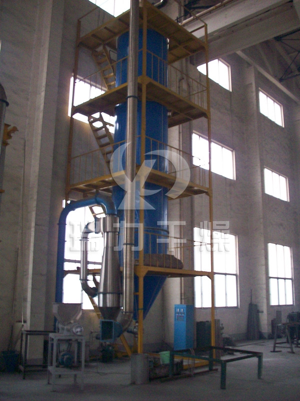 壓力噴霧干燥機工作過程為:料液通過隔膜泵高壓輸入,噴出霧狀液滴,然后同熱空氣并流下降,大部分粉粒由塔底排料口收集,廢氣及其微小粉末經(jīng)旋風(fēng)分離器分離,廢氣由抽風(fēng)機排出,粉末由設(shè)在旋風(fēng)分離器下的收粉筒收集,風(fēng)機出口處還可裝備二級除塵裝置,回收率在96%-98%。