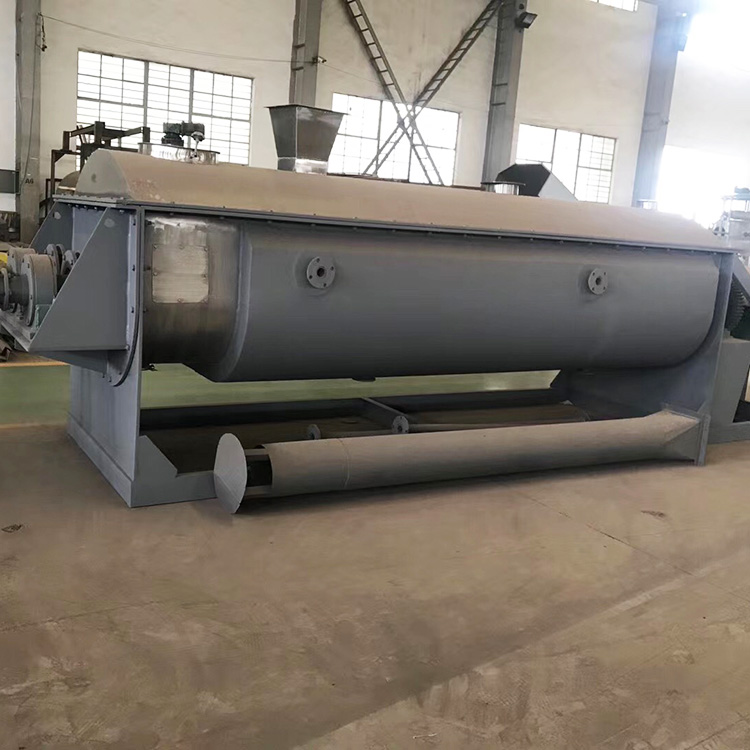 空心軸上密集排列著楔型中空漿葉,熱介質經空心軸流經漿葉。單位有效容積內傳熱面積廣,熱介質溫度從-40℃到320℃,可以是水蒸汽,也可以是液體型:如熱水、導熱油等。間接傳導加熱,沒有攜帶空氣帶走熱量,熱量均用來加熱物料。熱量損失僅為通過器體保溫層向環(huán)境的散熱。楔型漿葉傳熱面具有自清潔功能。物料顆粒與楔型面的相對運動產生洗刷作用,能夠洗刷掉楔型面上附著物料,使運轉中一直保持著清潔的傳熱面。漿葉干燥機的殼體為Ω型,殼體內一般安排二到四根空心攪拌軸。殼體有密封端蓋與上蓋,防止物料粉塵外泄而充分發(fā)揮作用。