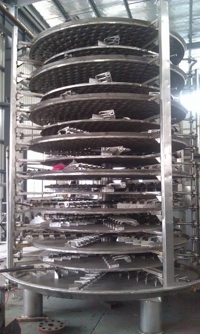 PLG系列盤式連續(xù)干燥機(jī)的一層盤上,帶有耙葉的耙臂做回轉(zhuǎn)運(yùn)動(dòng),使耙葉連續(xù)地翻轉(zhuǎn)物料,物料沿著指數(shù)螺旋線流過(guò)干燥盤表面,在小干燥盤上的物料移到外緣,并在外緣落到下方的大干燥盤外緣,在大干燥盤上的物料向里移動(dòng)并從中間落料落入下一層小干燥盤中,大小干燥盤上下交替排列,物料得以連續(xù)地流過(guò)整個(gè)干燥機(jī),中空的干燥盤內(nèi)通入加熱介質(zhì),加熱介質(zhì)從一端進(jìn)入另一端導(dǎo)出,已干燥物料從底層干燥盤落到殼體底層,最后被耙葉移動(dòng)到料口排出。蒸發(fā)出來(lái)的水蒸汽由設(shè)置在頂部的排濕口排出,夾帶的粉塵由脈沖除塵器回收,尾氣由排濕風(fēng)機(jī)排出室外。底部排出的干物料可直接包裝。