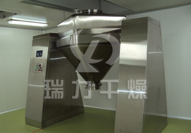 將物料裝入方錐形密閉混合桶內(nèi),料斗對(duì)稱的軸線與回轉(zhuǎn)軸軸線成一夾角,不同組分物料在密閉的料斗中進(jìn)行三維空間運(yùn)動(dòng),產(chǎn)生強(qiáng)烈翻轉(zhuǎn)和擴(kuò)散收縮作用,達(dá)到好的混合效果。