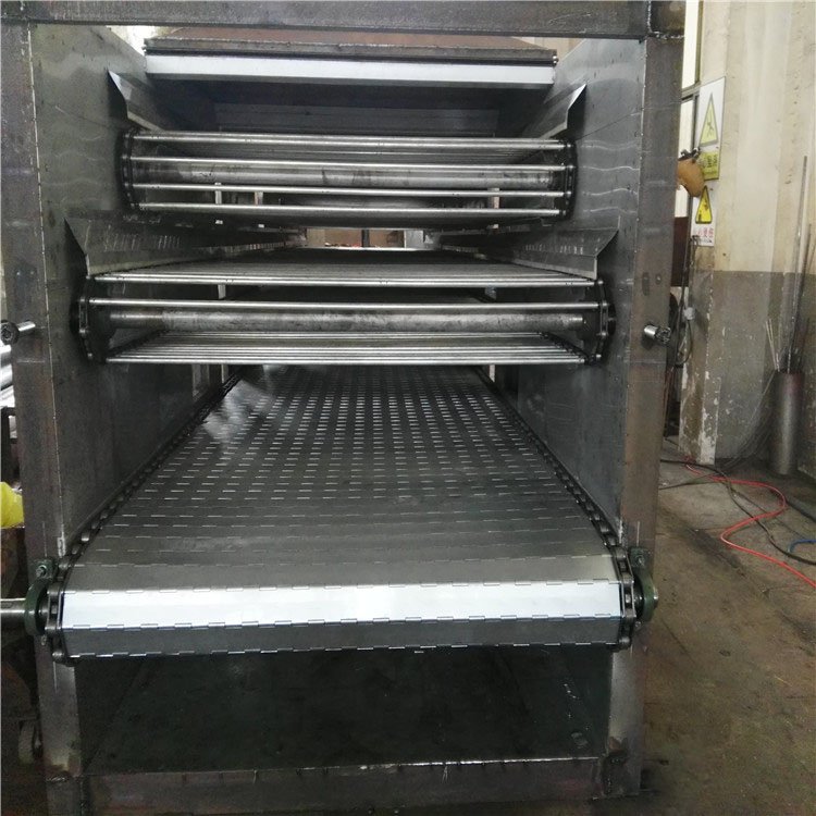 物料由加料器均勻地鋪在網(wǎng)帶上,網(wǎng)帶一般采用12-60目不銹鋼絲網(wǎng),由傳動(dòng)裝置拖動(dòng)在干燥機(jī)內(nèi)移動(dòng)。干燥機(jī)由若干單元組成,每一單元熱風(fēng)獨(dú)立循環(huán),部分尾氣由專門排濕風(fēng)機(jī)排出,廢氣由調(diào)節(jié)閥控制,熱氣由下往上或由上往下穿過(guò)鋪滿物料的網(wǎng)帶完成熱量與質(zhì)量傳遞的進(jìn)程,帶走物料水份。網(wǎng)帶緩慢移動(dòng),運(yùn)行速度可根據(jù)物料溫度自由調(diào)節(jié),干燥后的成品連續(xù)落入收料器中。上下循環(huán)單元根據(jù)用戶需要可靈活配備,單元數(shù)量亦可根據(jù)需要選取。