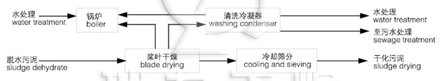 (2)熱源產(chǎn)生。可使用熱蒸汽或熱油作為熱交換的熱源。一般熱流體的溫度為180℃-200℃。熱介質(zhì)分別被引入中空的干燥機殼體和轉(zhuǎn)動的軸槳葉等所有與污泥接觸進(jìn)行熱交換的加熱金屬表面。