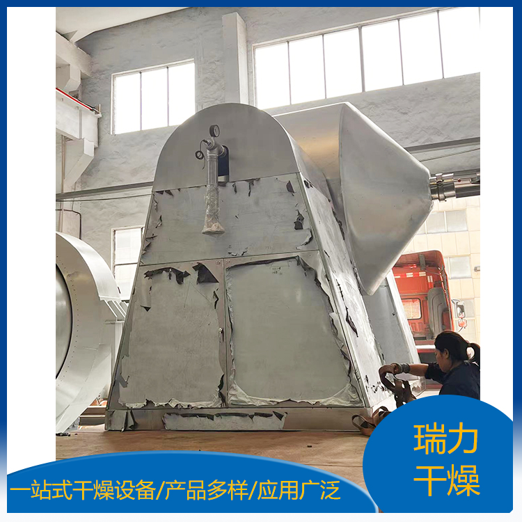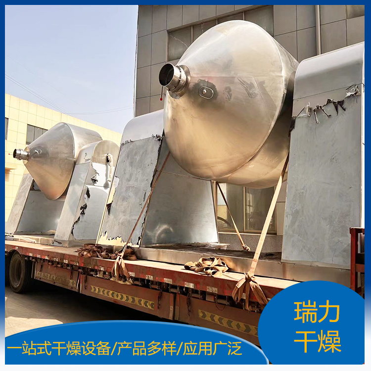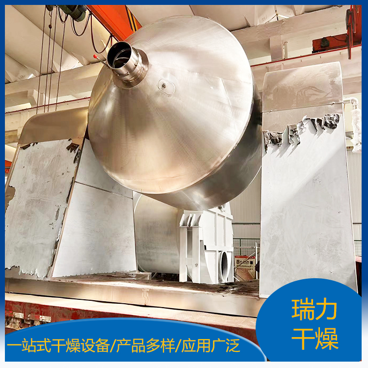 雙錐回轉(zhuǎn)真空干燥機為雙錐形的回轉(zhuǎn)罐體,罐內(nèi)在真空狀態(tài)下,向夾套內(nèi)通入蒸汽或熱水進行加熱,熱量通過罐體內(nèi)壁與濕物料接觸,濕物料吸熱后蒸發(fā)的水汽,通過真空泵經(jīng)真空排氣管被抽走。由于罐體內(nèi)處于真空狀態(tài),且罐體的回轉(zhuǎn)使物料不斷的上下內(nèi)外翻動,故加快了物料的干燥速度,提高干燥效率,達到均勻干燥的目的。雙錐回轉(zhuǎn)真空干燥機系統(tǒng)主要由雙錐回轉(zhuǎn)真空干燥機、冷凝器、除塵器、真空抽氣系統(tǒng)、加熱系統(tǒng)、冷卻系統(tǒng)、電控系統(tǒng)等組成。